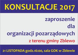 Wójt Gminy Zblewo serdecznie zaprasza przedstawicieli wszystkich organizacji pozarządowych z terenu Gminy Zblewo na konferencję dotyczącą konsultacji projektu rocznego programu współpracy Gminy Zblewo z organizacjami pozarządowymi. W spotkaniu wezmą także udział przedstawiciele instytucji zewnętrznych, którzy przybliżą tematykę możliwości pozyskiwania przez stowarzyszenia środków na swoją działalność. Spotkanie odbędzie się we wtorek (21 listopada 2017 r.) o godz.16:00 w Sali Gminnego Ośrodka Kultury w Zblewie. Serdecznie zapraszamy.