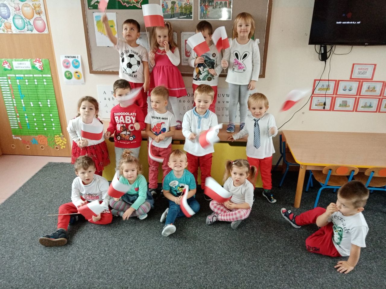 Wszystkie dzieci świętowały dzisiaj nadzwyczaj uroczyście ten wyjątkowy dla nas - Polaków dzień. W przedszkolu od najmłodszych lat uczymy dzieci patriotyzmu, przywiązania do swojej Ojczyzny oraz wpajamy szacunek dla polskich symboli. Przedszkolaki wyruszyły dzisiaj na przemarsz z flagami biało-czerwonymi wokół przedszkola. Z radością i dumą śpiewały Hymn Polski. Poznawały mapę naszego kraju i ważne dla naszej historii postacie na czele z marszałkiem Józefem Piłsudskim.