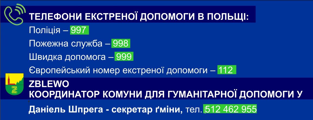 1 березня голова Gminy Zblewo призначив координатора гуманітарної допомоги для України. Це був Даніель Шпрега, секретар ґміни. Також було створено муніципальну команду з управління гуманітарною допомогою для України.