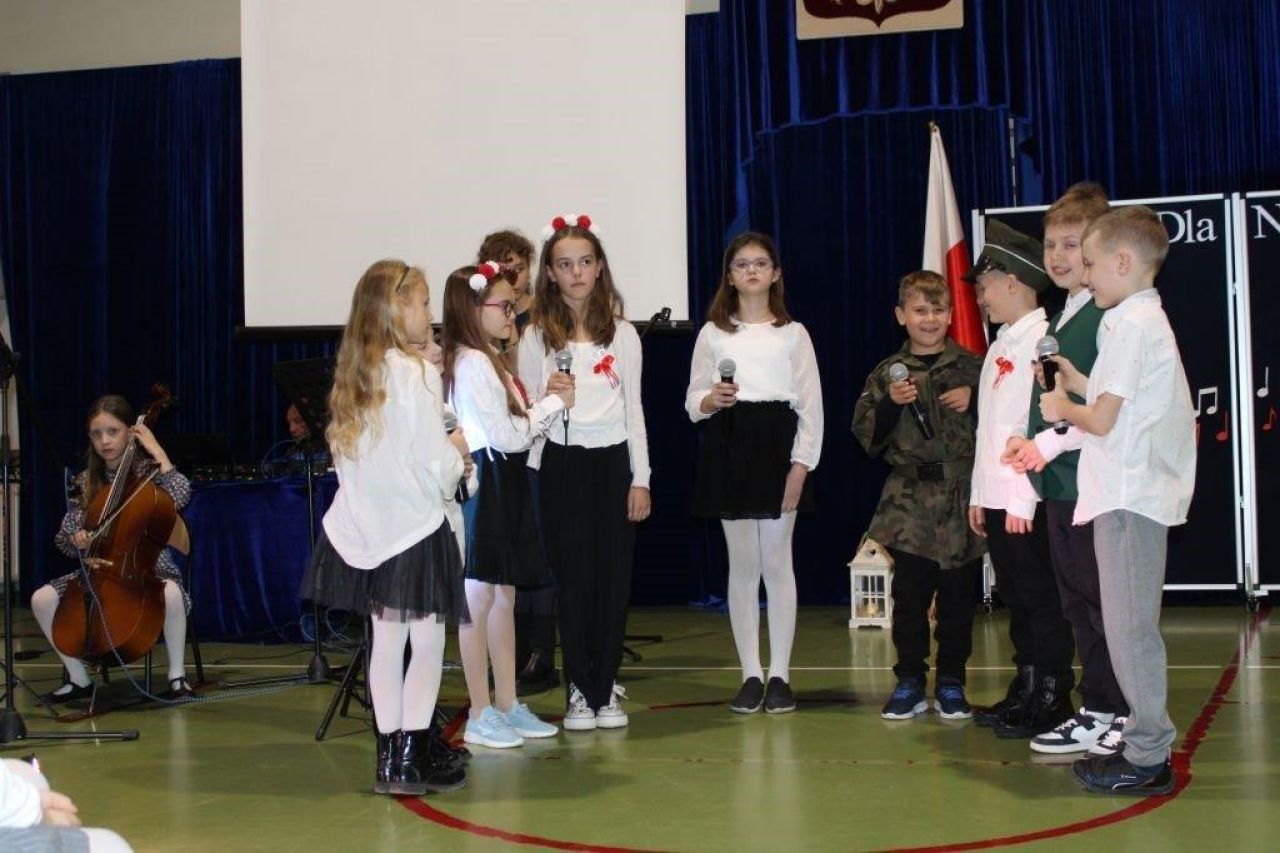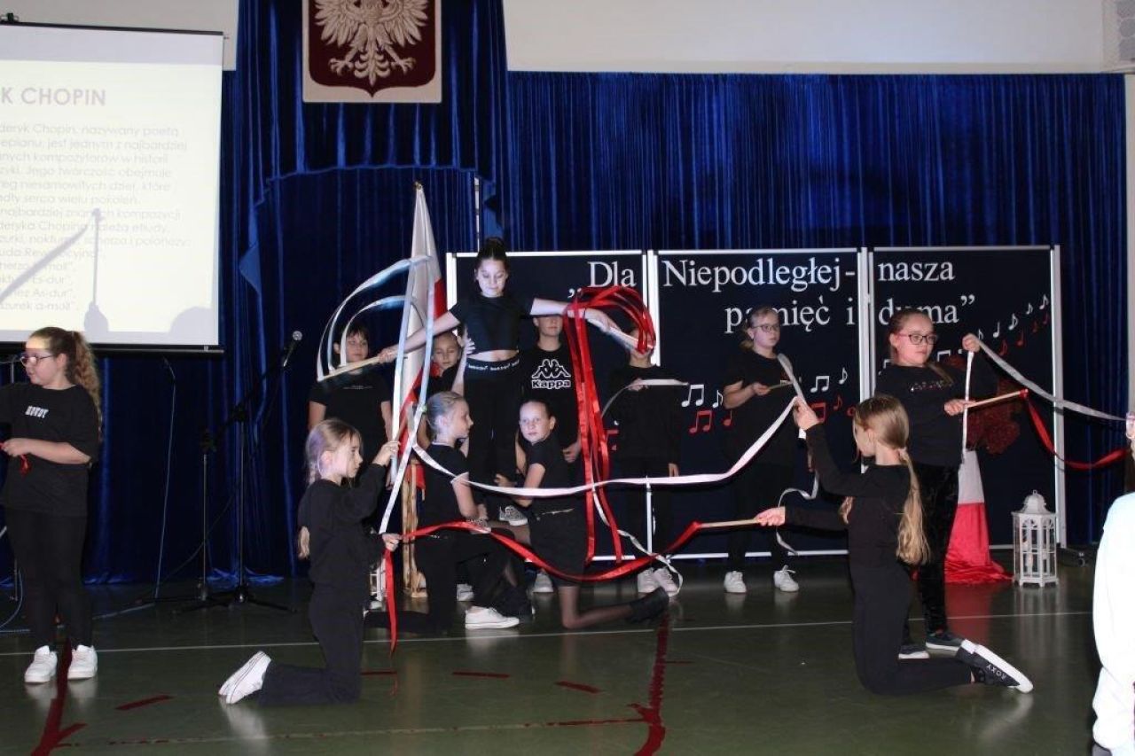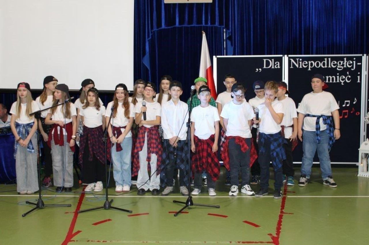 Piękny śpiew uczniów, grą na keyboardzie uświetniła Maria Czapiewska, a na skrzypcach zagrała uczennica kl.VI Patrycja Nadolska. Nie zabrakło również poezji śpiewanej i tańca - w przepięknym układzie tanecznym zaprezentowały się uczennice klas czwartych przygotowane przez Alicję Kubik. Szczególną atrakcją akademii był autorski rap uczniów kl. V b, zatytułowany „Dla Niepodległej”. Nowoczesna forma utworu, pełna energii i pasji, połączyła tradycję z młodzieńczym spojrzeniem na historię Polski, spotykając się z gorącym aplauzem publiczności.